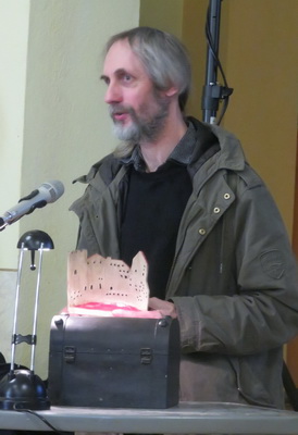 Die Begrüßung durch den Vereinsvorsitzenden, Dr. Konrad Kühne, nahm diesmal einen etwas anderen Verlauf, galt es doch ein Jubiläum zu feiern. Seit 25 Jahren gibt es diese traditionelle Veranstaltung, die an wechselnden Orten stattfindet, manchmal auch außerhalb des Landkreises. Initiator und Organisator des Tages der Heimatpflege war und ist immer noch Heiko Einecke. Deshalb wurde er auch unter großem Beifall mit dem Ehrengeschenk des Altertums- und Verkehrsvereins Querfurt und Umgebung e.V. ausgezeichnet, einem eigens für den Verein von der Burgtöpferei kreierten Windlicht mit der stilisierten Burg-Ansicht."