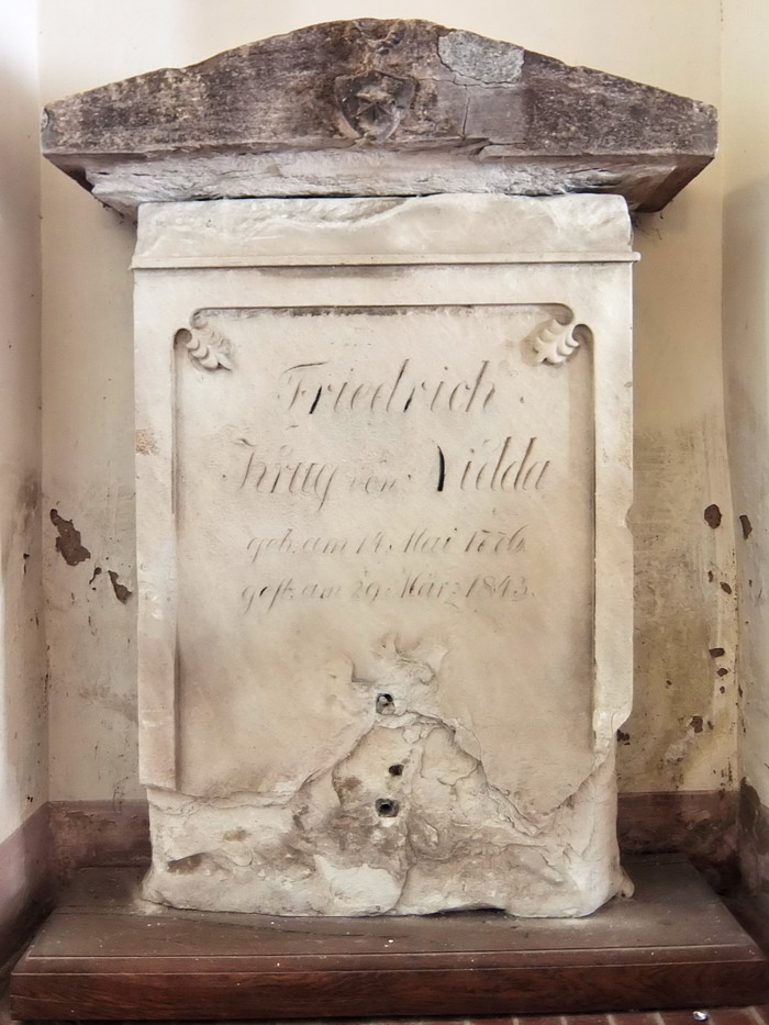 Friedrich Ludwig Albert Franz Krug von Nidda, heute fast unbekannt, war zu Goethes Zeiten, neben Novalis, Wilhelm Hauff, Heinrich Heine uva. ein durchaus bekannter romantischer Dichter. Sein Grab auf dem Friedhof in Gatterstädt, einem Ortsteil von Querfurt wurde 1988 eingeebnet. Der Grabstein fand einen würdigen Platz in der Friedhofskapelle, wo er anlässlich seines 150. Todestages feierlich aufgestellt wurde. Hier ist er auch vor weiterer Verwitterung geschützt und ein letztes Zeugnis.