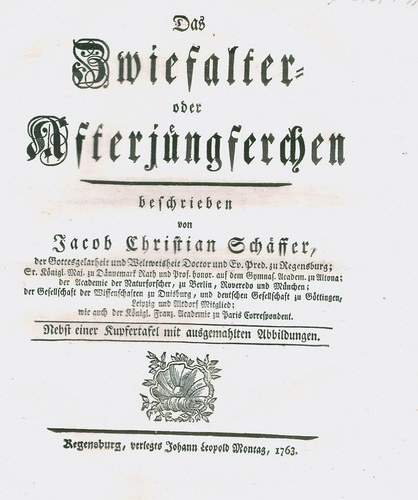 „Das Zwiefalter- oder Afterjüngferchen“, 1763 nebst einer Kupfertafel mit ausgemahlten Abbildungen, Regensburg, Johann Leopold Montag