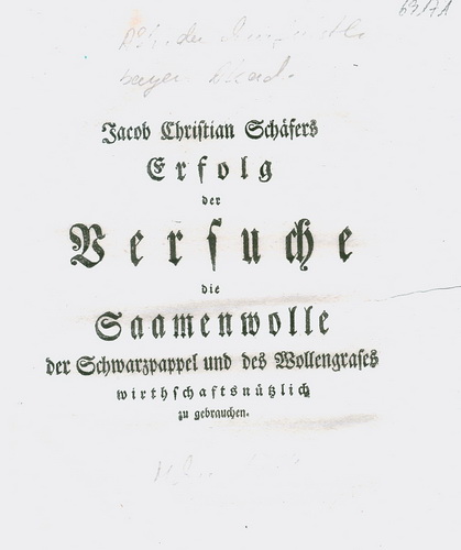 "Erfolg der Versuche die Saamenwolle der Schwarzpappel und des Wollgrases wirtschaftsnützlich zu gebrauchen“, aus: Abh. der churfürstl. Bayer. Akademie der Wiss. München 1764