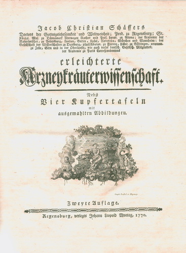 "Erleichterte Arzneykräuterwissenschaft“ , 1770 nebst vier Kupfertafeln mit ausgemahlten Abbildungen, Zweite Auflage, Regensburg, Johann Leopold Montag,