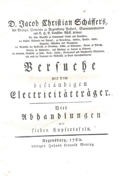 „Versuche mit dem beständigen Electricitätträger“ , Vier Abhandlungen mit 7 Kupferstichen, 1780 Regensburg, Verleger Johann Leopold Montag,