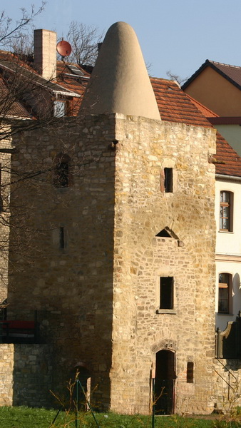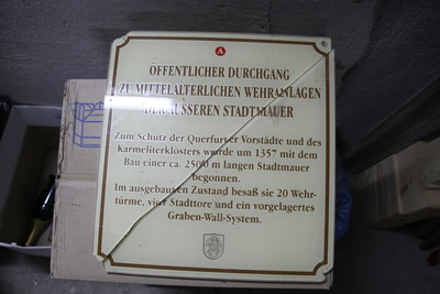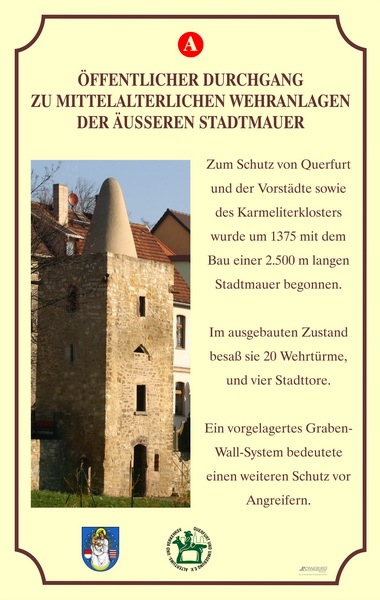 Die Tafel informiert Vorbeigehende über eine mittelalterliche Wehranlage, hier einen seltenen und guterhaltenen Wehrturm aus dem Ende des 14. Jahrhunderts. Er gehörte zur äußeren Stadtbefestigung und ist einer von 20 Wehrtürmen, von denen, mit diesem noch 4 weitere im Stadtgebiet von Querfurt zu finden sind. Er wurde Ende der 90er Jahre im Auftrag der Stadt Querfurt restauriert.
