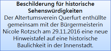Gemeinsam mit dem Bürgermeister Peter Kunert und unter großem Beifall der Anwesenden wurde das Geheimnis der Tafel gelüftet. Herr Lasse übergab im Auftrag des Vereins die Informationstafel der Stadt Querfurt und damit seiner Bestimmung. Er nahm dies zum Anlass im Namen des Vereins, der sich auch für die Erhaltung der Baudenkmäler einsetzt, dem Bürgermeister Kunert den Dank auszusprechen, für die vielen von der Stadt vollzogenen und gelungenen Restaurierungsmaßnahmen.