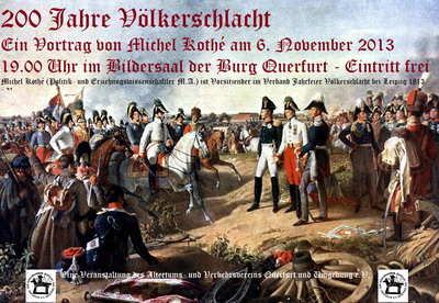 Mit diesem attraktiven Plakat hatte der Altertums- und Verkehrsverein Querfurt und Umgebung e.V. zu einem Vortrag aus Anlass der "200 Jahrfeier der Völkerschlacht bei Leipzig" eingeladen, da dieses Thema natürlich auch für Bürger unserer Region von Interesse ist.