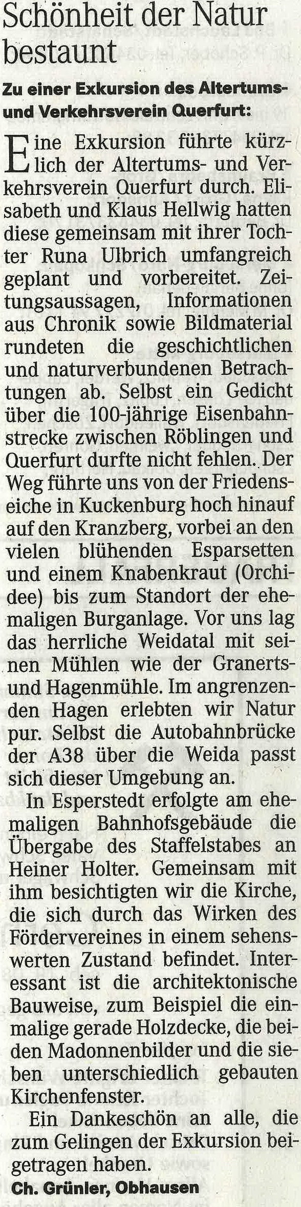 Am 25. Mai 2013, fand unter Führung der Eheleute Hellwig aus Obhausen eine hervorragend organisierte Wanderung von Kuckenburg nach Esperstedt mit einer Rast im Holter'schen Bauernhof statt. Die Frühlingswanderungen werden zu einer guten Tradition. Hiermit möchten der Vereinsvorstand und auch die Teilnehmer der Wanderung nochmals ein herzliches Dankeschön Herrn Klaus Hellwig und seiner Ehefrau Elisabeth sowie den Eheleuten Heike und Heinrich Holter aussprechen. Ein Leserbrief vom 18.06.2013, veröffentlicht in der MZ bringt es noch einmal auf den Punkt. Besser kann man das Wandererlebnis nicht wiedergeben: