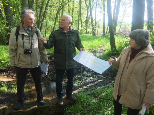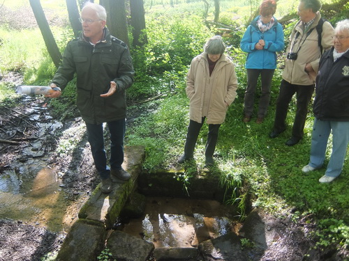 Mit guter Laune ging es zu den Brunnen - Erlenborn, Rotenborn und dem Sandborn bis zu den Lautersburgteichen. Das Vereinsmitglied Bernhard Schneider, studierter Geologe, erläuterte die geologische Struktur des Brunnentales.